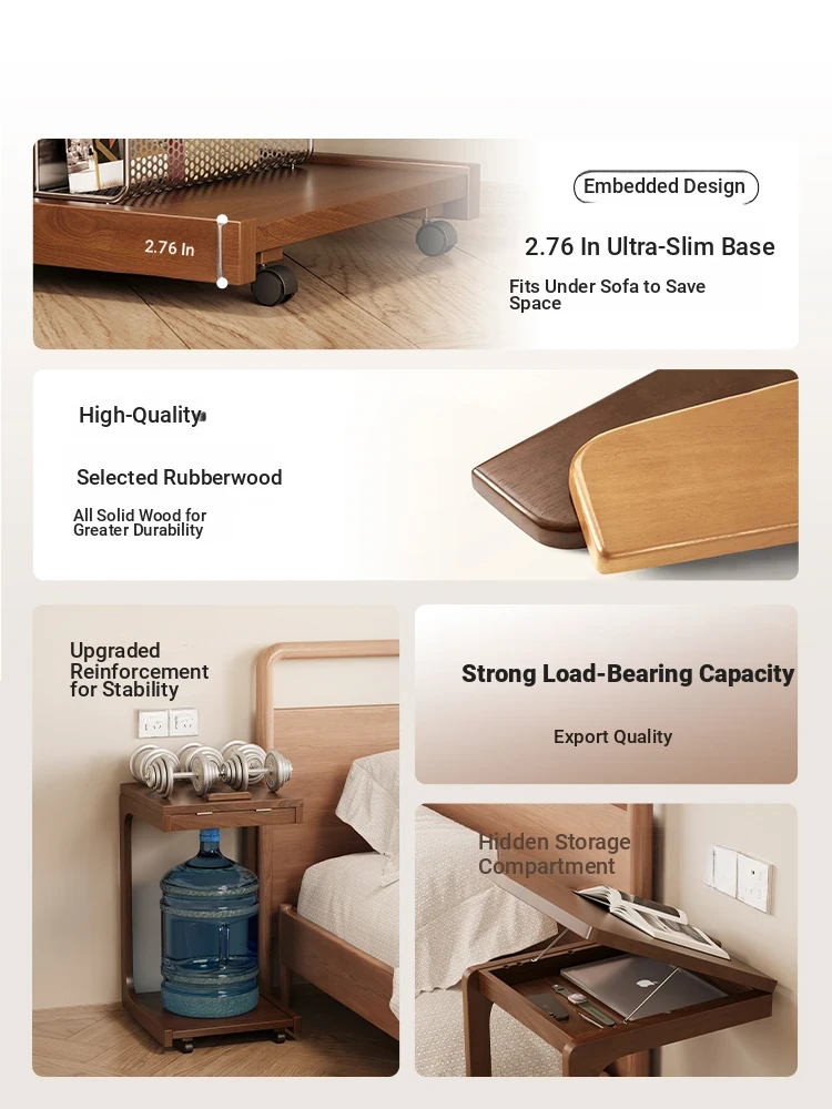 Stylish Solid Wood C-Shaped Side Table with Wheels – Versatile Movable Coffee Table for Living Room, Flip-Top Nightstand for Bedroom, Perfect Bedside Companion