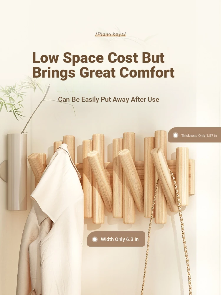Solid Wood Piano Key Wall-Mounted Coat Rack - No Drilling Required, Perfect for Entryways and Bedrooms, Stylish and Functional Hook for Hats and Coats Behind Doors