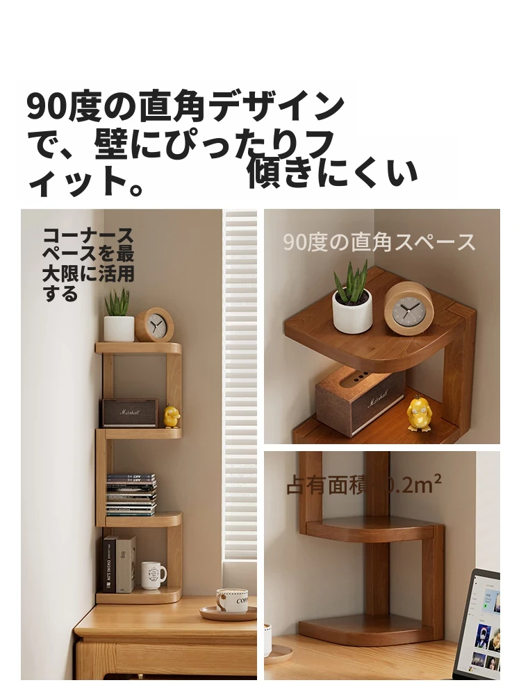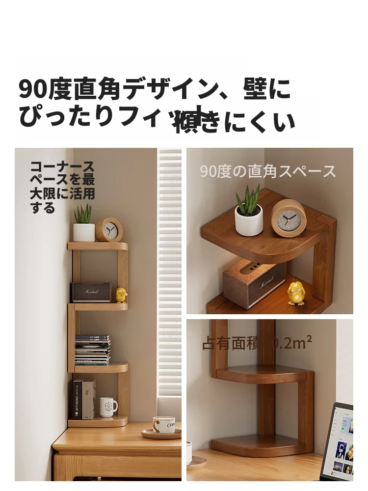 デスク用コーナー収納ラック - 三角形デザインでスペースを有効活用!ベッドサイドや壁隅にぴったりの天然木製キャビネット。おしゃれで機能的な収納ソリューションで、あなたの生活空間を整えます!
