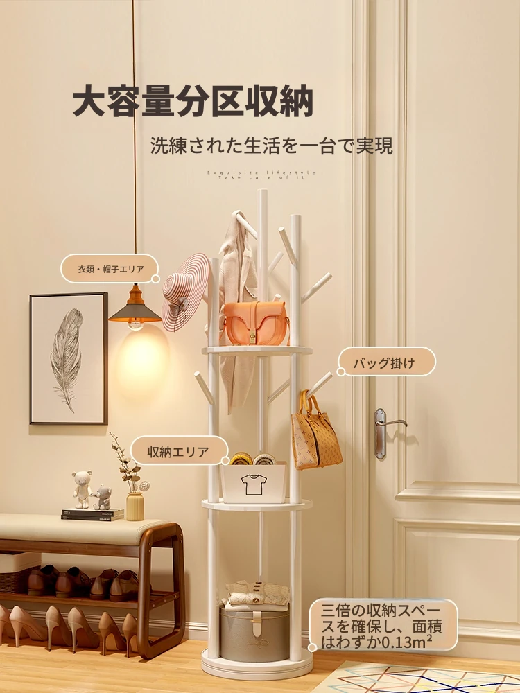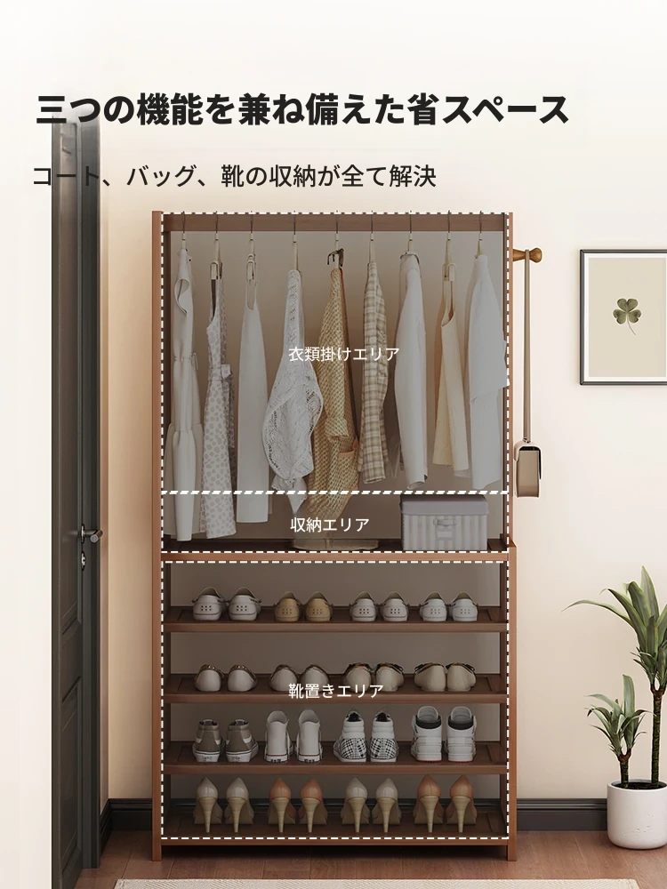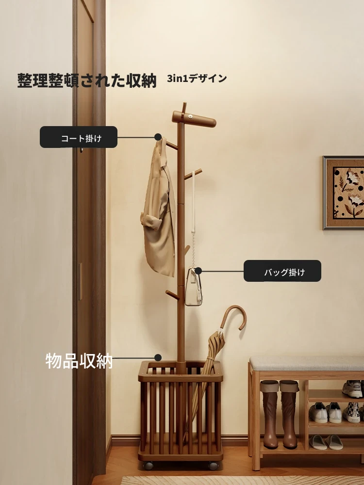 多機能スタンド型コートハンガー - おしゃれで便利な玄関収納!衣類、帽子、靴を一体化してスッキリ整理。家庭用にも最適で、シンプルなデザインがどんな部屋にもマッチします。あなたの生活空間を美しく整えましょう!
