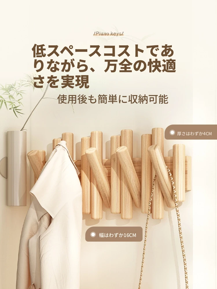 無垢材のピアノキーコートハンガー - 壁掛け式で簡単取り付け、玄関や寝室にぴったり!ドアの裏に最適な衣類・帽子収納、スタイリッシュで機能的なデザイン。おしゃれな空間を演出します!