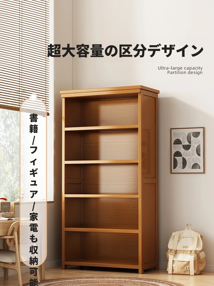 壁に寄り添うシンプルな木製書棚 - 家庭用・子供・学生向けの多層収納ラック!一体型のスタイリッシュなデザインで、すっきりとした空間を演出します。大切な本や雑貨を美しく収納できる、理想的なアイテムです。