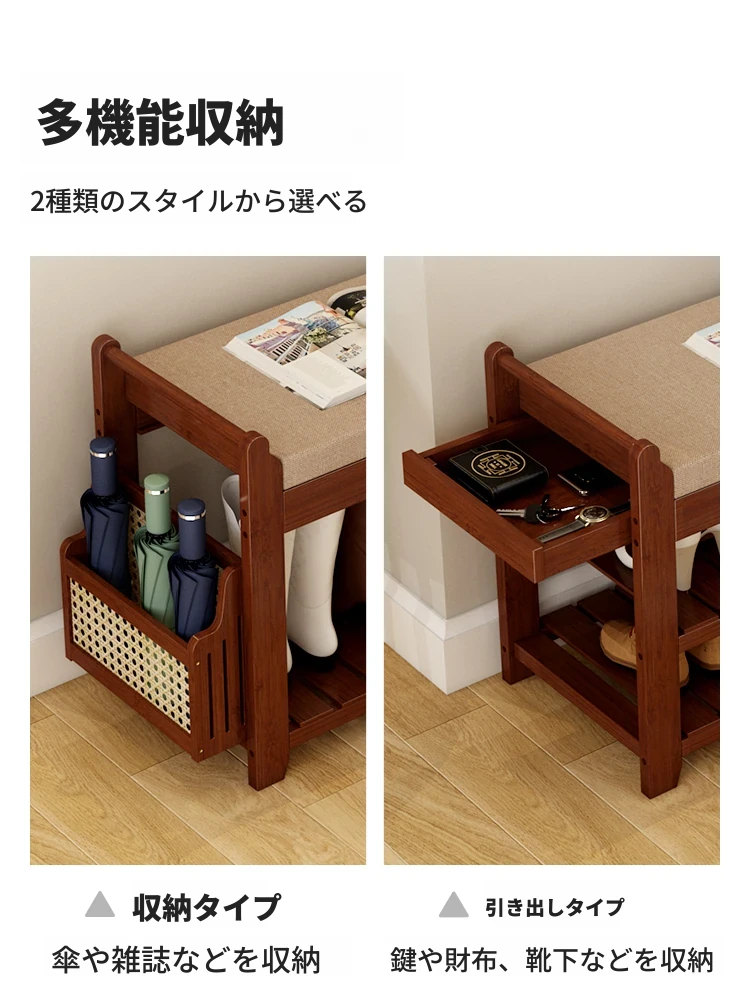 おしゃれなスリッパ収納ベンチ - 家庭用・玄関用の実木製スツール。多機能ストレージキャビネットで、シンプルなデザインの多層シューラック。優れた収納力で、靴をスッキリ整理!